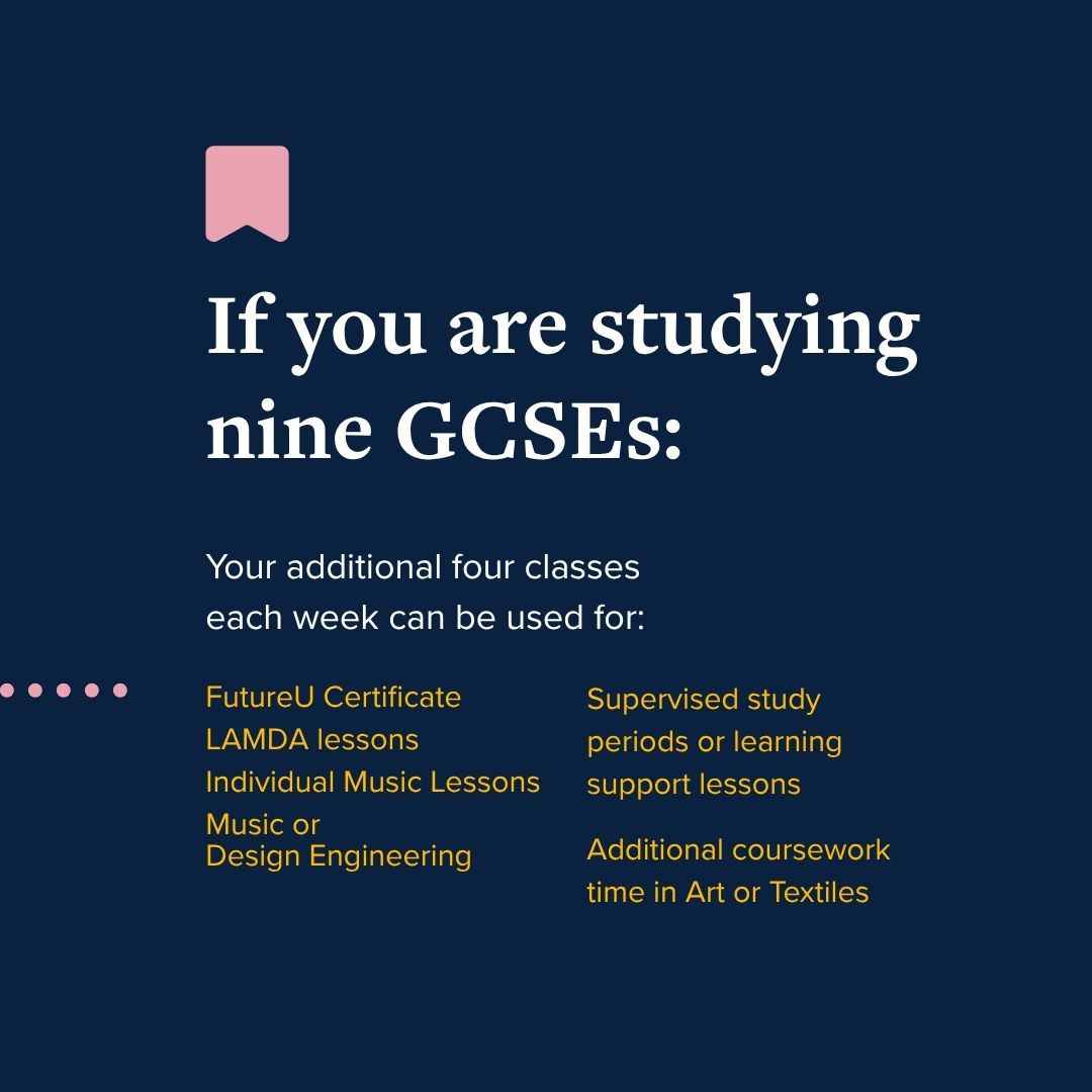 Each pupil will have the option to study either 9 or 10 GCSEs and will be able to make a number of subject choices at Easter in Year 9.